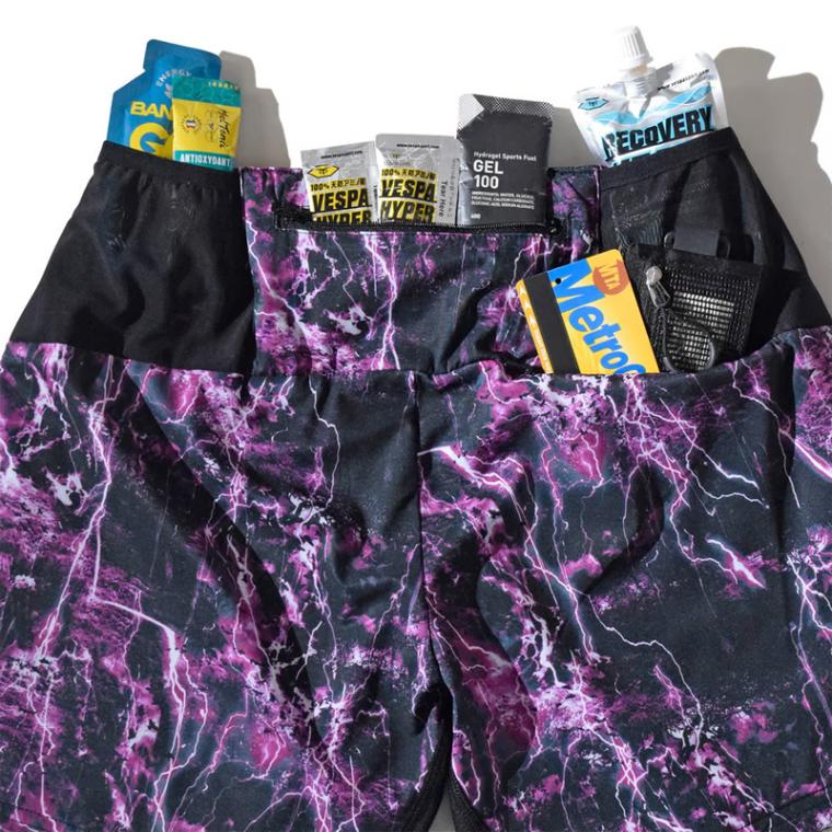 両サイドのポケットの他、アクティビティ時の動きの妨げにならない腰部分には大きめのジップ付きポケットを、その左右にはジェルなどの補給食や小物の収納に便利なストレッチメッシュのポケットを搭載。